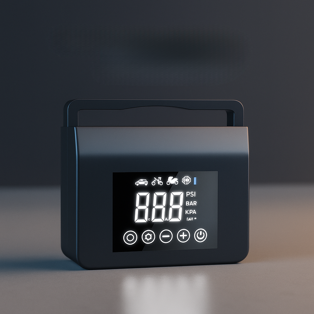 Set PSI, auto-stop, adapters included.